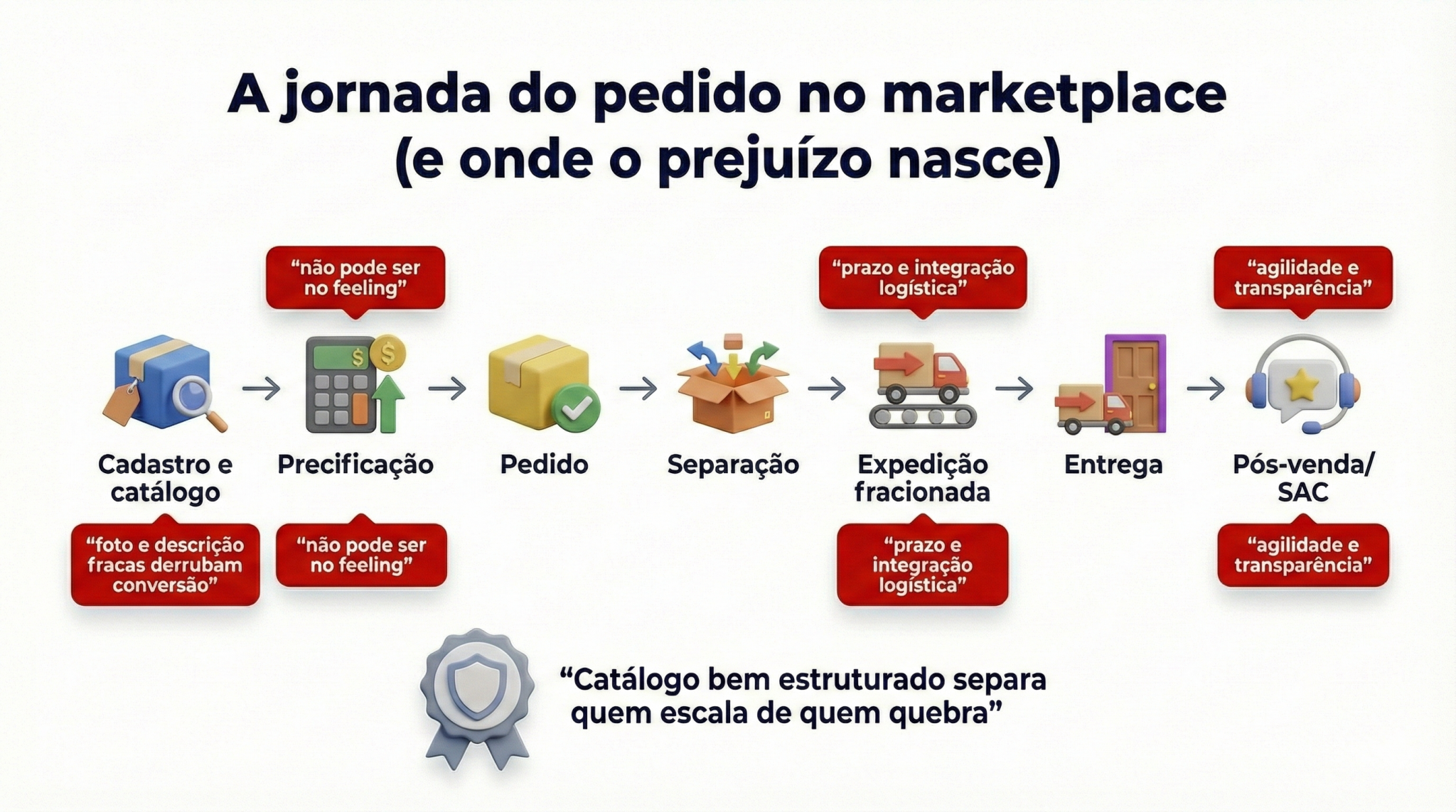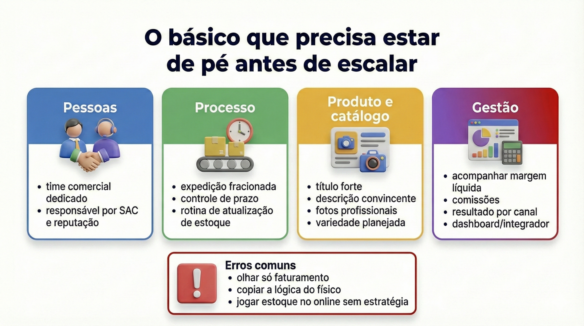Marketplaces não são solução mágica: são canal. E canal exige operação redonda, comercial dedicado e planejamento real. O material reforça que o sucesso passa por logística bem integrada, estoque confiável, capacidade de expedição no prazo e uma estrutura mínima para atendimento e pós-venda — porque o marketplace controla reputação com regras rígidas e pode reduzir relevância ou até suspender quem falha.