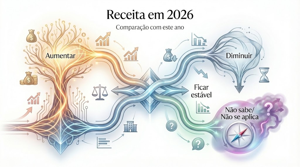 Sobre os próprios negócios, a expectativa de receita em 2026 varia conforme o porte. Médias e grandes empresas e MPEs demonstram expectativa de aumento, seguida de estabilidade. Já entre MEIs, predomina a percepção de estabilidade. Em todos os grupos, chama atenção o nível de incerteza declarado por parte dos respondentes.