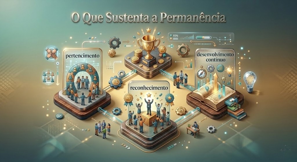 Outro ponto central é que retenção não é consequência automática de salário ou benefícios. O conteúdo reforça que pertencimento, reconhecimento e desenvolvimento contínuo fazem diferença real na permanência e no desempenho das pessoas. Empresas que ignoram esses fatores tendem a enfrentar desgaste, queda de motivação e perda de talentos.