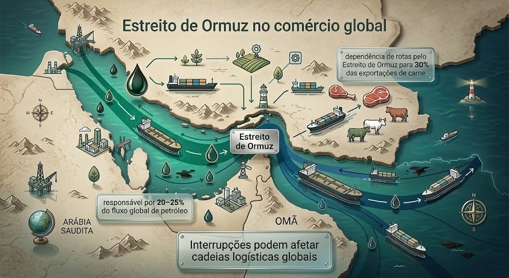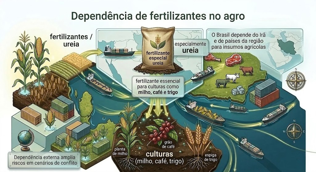 Além dos insumos, existe um ponto estratégico pouco discutido fora do setor: as rotas internacionais de comércio. Parte relevante do fluxo energético e logístico mundial passa por um corredor marítimo crucial na região. Se a situação se deteriorar, gargalos logísticos podem alterar custos de transporte, prazos de entrega e previsibilidade das cadeias globais que sustentam exportações do agro.