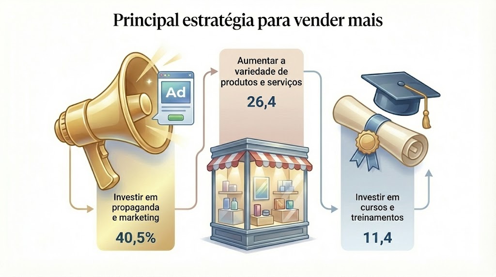 Entre as estratégias mencionadas, algumas se destacam com mais força dependendo do setor e da região. Investimentos em propaganda e marketing, ampliação do portfólio e capacitação aparecem como caminhos escolhidos para estimular o crescimento e enfrentar um ambiente competitivo.