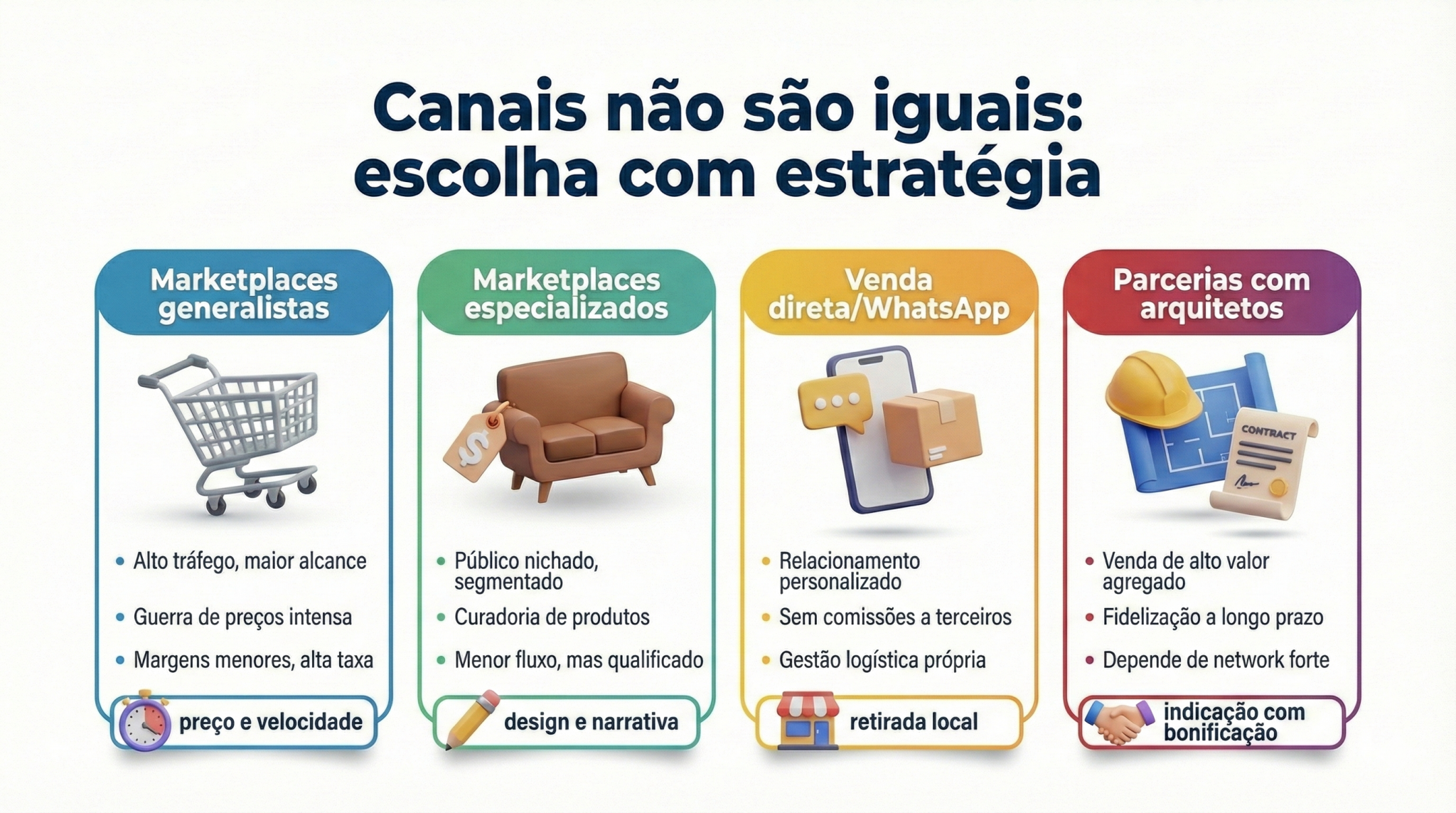 Nem todo canal serve para todo produto — e esse é o tipo de verdade que dói, mas salva caixa. Existem canais que premiam preço e velocidade, e outros que valorizam design, narrativa e ticket mais alto. O problema é quando o negócio escolhe o canal errado e tenta compensar no improviso: entra em ciclo de desconto, perde relevância por atraso ou vira refém de regras que não controla. Canal é estratégia, não presença.