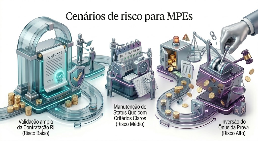 Os possíveis cenários variam entre validação ampla da contratação PJ, manutenção com critérios objetivos ou maior rigor na comprovação de autonomia. Cada caminho altera a exposição jurídica e exige postura estratégica. Empresas que documentam autonomia e mantêm coerência entre contrato e prática tendem a atravessar qualquer cenário com mais segurança.
