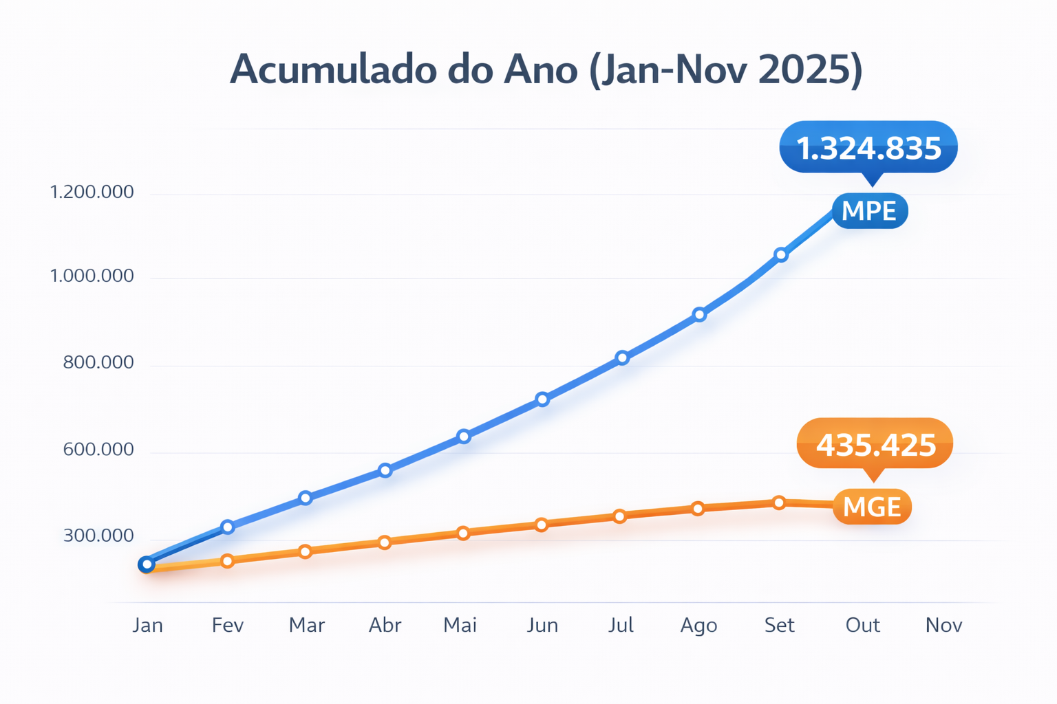 O desempenho das MPE em novembro de 2025 foi determinante para o saldo nacional. Enquanto as Médias e Grandes Empresas (MGE) contribuíram com uma fatia menor do total de vagas, as micro e pequenas empresas responderam por mais de 90% dos empregos líquidos gerados no período, consolidando uma tendência observada ao longo de todo o ano de 2025.